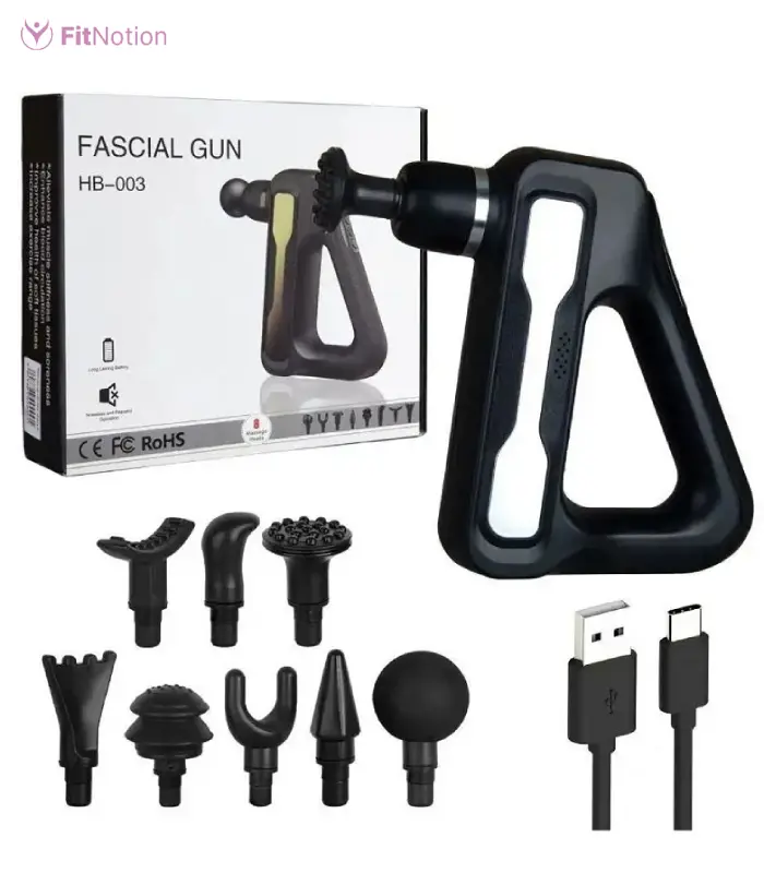 The Fascia Gun Massager HB-003 use is a professional-grade deep tissue massage gun designed to relieve muscle soreness, stiffness, and fatigue. With powerful percussive therapy, it targets tight muscles and improves blood circulation — ideal for athletes, fitness lovers, and anyone suffering from body pain. Its compact design and silent motor make it perfect for home or on-the-go relaxation.